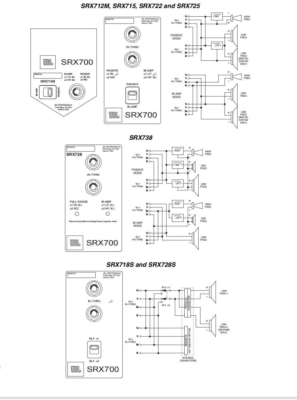 所有SRX700二路或三路揚(yáng)聲器都可用單功放或雙功放驅(qū)動。驅(qū)動模式可用現(xiàn)在流行的、安裝在音箱輸入面板上的撥動開關(guān)進(jìn)行轉(zhuǎn)換。超低音揚(yáng)聲器中的開關(guān)采用相同的安排:選擇±1或±2。