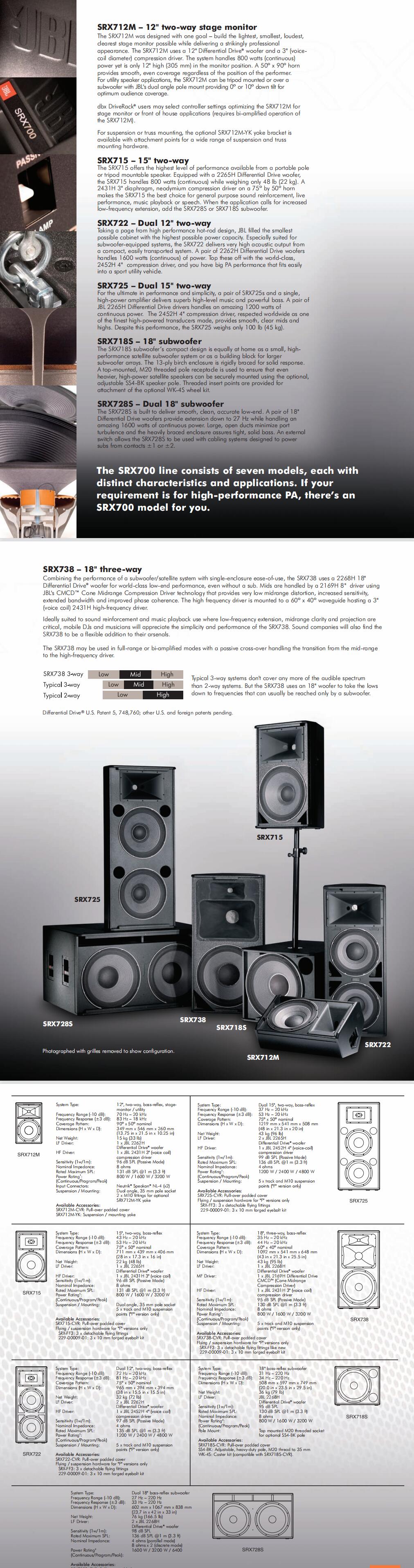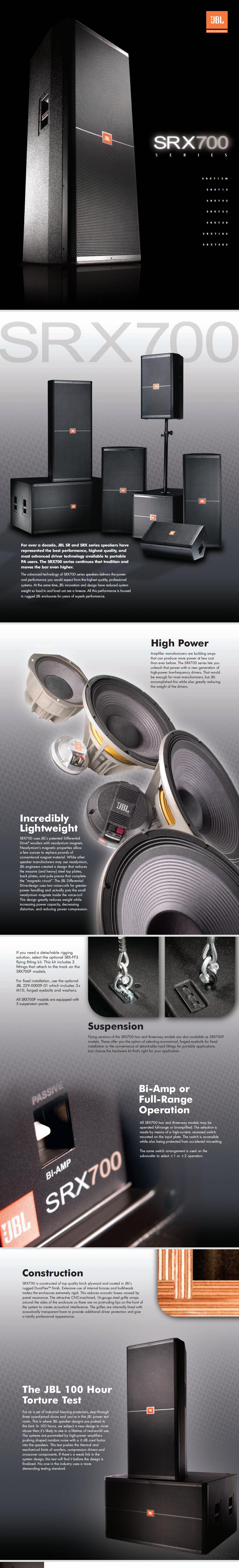 SRX700全系列有7個型號,可自由搭配,滿足每個場地的特定要求。為了使工程商按實(shí)際場地要求來發(fā)揮音箱效果,又不破壞音箱體,SRX700 特設(shè)有按不同需要的吊掛點(diǎn)。還有,用戶可按預(yù)算和實(shí)際使用要求選取雙功放或單功放驅(qū)動模式,以便全面發(fā)揮JBL音箱的佳效果。
