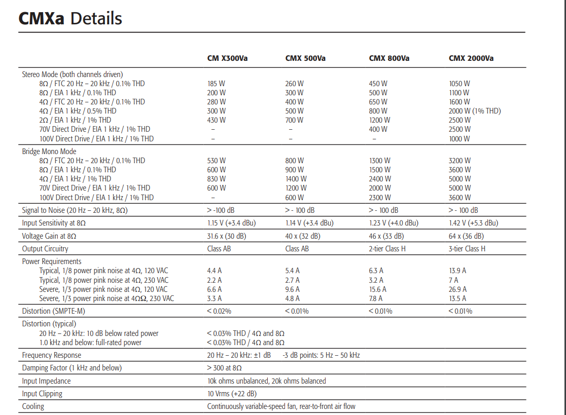 全新的CMXa系列是一款經(jīng)濟(jì)和堅(jiān)固的功率放大器,為滿足系統(tǒng)集成所需而研發(fā)。 歷經(jīng)檢驗(yàn)和高度可靠的功放平臺(tái)CMXa功放融合QSC超過(guò)40年的無(wú)故障設(shè)計(jì)理念,在遞送強(qiáng)勁功率同時(shí),免除故障的影響。這些功放設(shè)計(jì)使用我們所擁有的功率組件。CMXa使用一個(gè)高冗余能力,高電流耐受力的環(huán)形變壓器,配合濾波電路確保產(chǎn)生充足的能量供給能力。集成先進(jìn)的晶體放大組件的CMXa功放可輸出高電平能力,甚至是使用在2歐姆低阻抗情形下。 功放輸出部分特色是使用了堅(jiān)固穩(wěn)定的AB和H類放大結(jié)構(gòu)。H類的*率可以減少對(duì)AC電源供給依賴并能有效降總體熱能。 所有的CMXa功放帶有短路輸出保護(hù)電路。自動(dòng)限制電流以保護(hù)功放免受短路損害,直至電路恢復(fù)正常。 CMXa功放也帶有DC直流保護(hù),即使在晶體組件故障或失效時(shí),也能免除揚(yáng)聲器系統(tǒng)遭受直流信號(hào)的損害。出眾的性能 CMXa功放可還原真實(shí)和*的廣播級(jí)音頻品質(zhì)?;パa(bǔ)型輸出電路使用*線性器件,在極低的失真條件下還原出、平坦的頻率響應(yīng)。SMT(表面貼片工藝)電路只有常規(guī)電路體積的1/3,可在2U機(jī)柜體積下滿足大功率輸出需求(CMX2000Va為3U體積)。不同于其它產(chǎn)品設(shè)計(jì),散熱片直接附著于CMXa輸出電路上,緊密的耦合提供了散熱效率,帶來(lái)更加強(qiáng)勁的冷卻能力。 CMXa系列有四款型號(hào)可供選擇。3款2U機(jī)架空間產(chǎn)品,功率覆蓋從300瓦至800瓦(在每通道4歐姆下)。一個(gè)3U機(jī)架空間型號(hào)提供2500瓦2歐姆每通道。所有四款型號(hào)都僅為16”深度。 每款型號(hào)帶有“V”的含義是指帶有70或10 0V電壓輸出能力,可滿足分布式揚(yáng)聲器系統(tǒng)驅(qū)動(dòng)需求。CMX300Va和CMX500Va必須被配置成橋接模式,使用M o n o形式來(lái)驅(qū)動(dòng)后級(jí)高阻系統(tǒng)。而CMX800Va和2000Va在Mono和雙通道模式下均可驅(qū)動(dòng)高阻揚(yáng)聲器。 參數(shù)詳情 “靈活匹配”不同負(fù)載需求,允許驅(qū)動(dòng)低至2歐姆負(fù)載,也可驅(qū)動(dòng)70/100V定壓揚(yáng)聲器系統(tǒng)。 “ 靈活選擇” 輸入端子, 可選XLR、接線柱或TRS輸入形式 “靈活易用”的輸出端子配置,可選NL4 SpeakonTM或條形輸出端子 機(jī)柜安裝深度小于40.6mm 1dB增益步進(jìn),增益旋鈕帶有止動(dòng)阻尼設(shè)置,可快速、準(zhǔn)確和便捷的調(diào)整增益 增益蓋板設(shè)計(jì),防止增益旋鈕誤觸 背板DIP開(kāi)關(guān)設(shè)計(jì),易于選擇立體聲、并接或橋接模式??蓡⒂没蛲S玫颓袨V波器或動(dòng)態(tài)限制器 低噪音可變速風(fēng)扇,排風(fēng)由后至前,保持機(jī)柜內(nèi)部涼爽