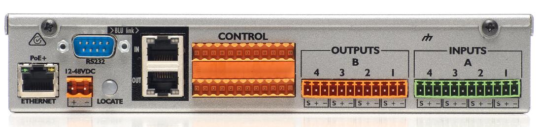 BLU-50是一款半機(jī)柜寬度的處理器,具有四個(gè)輸入和四個(gè)輸出的固定配置,可設(shè)置的信號處理,邏輯處理和BLU Link。該設(shè)備可以使用附帶的12VDC電源供電,也可以通過端子塊連接器接收12-48VDC的電源供電。BLU-50也可以通過以太網(wǎng)端口PoE +供電,從而僅使用一根Cat 5e電纜就可實(shí)現(xiàn)對設(shè)備的供電、設(shè)置、控制和監(jiān)測。