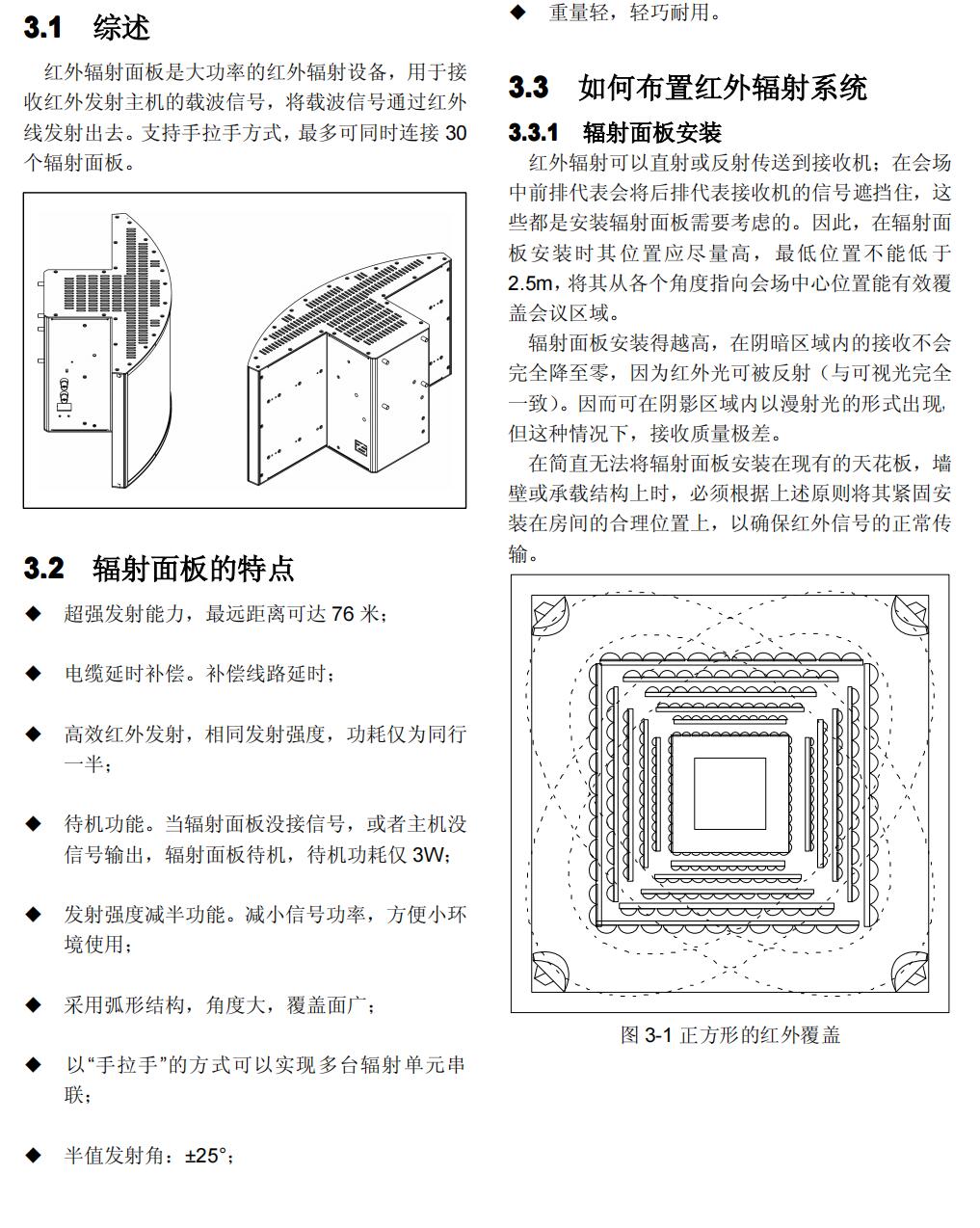 CR-IR3001紅外輻射面板是大功率的紅外輻射設(shè)備,用于接收紅外發(fā)射主機的載波信號,將載波信號通過紅外線發(fā)射出去。支持手拉手方式,最多可同時連接30個輻射面板。
